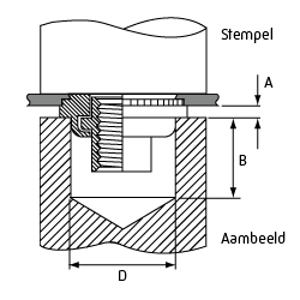 Een aambeeld met de correct gevormd gatmaat wordt in de installatiepers geplaatst. De moer wordt met de kartels naar boven in het aambeeld geplaatst.